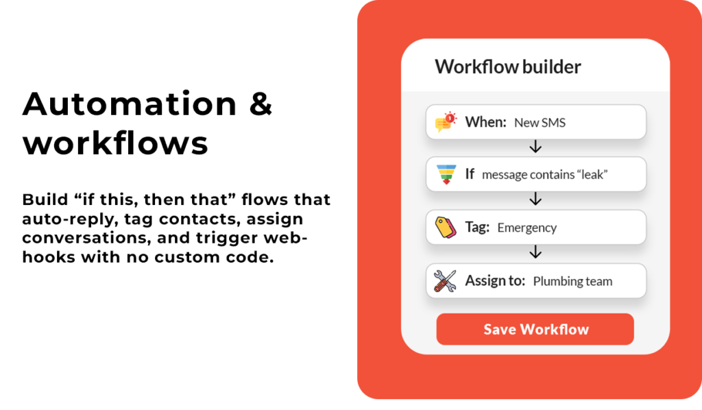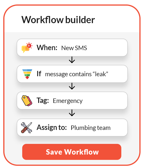 Trigger workflows based on message content, keywords, tags, or business hours.